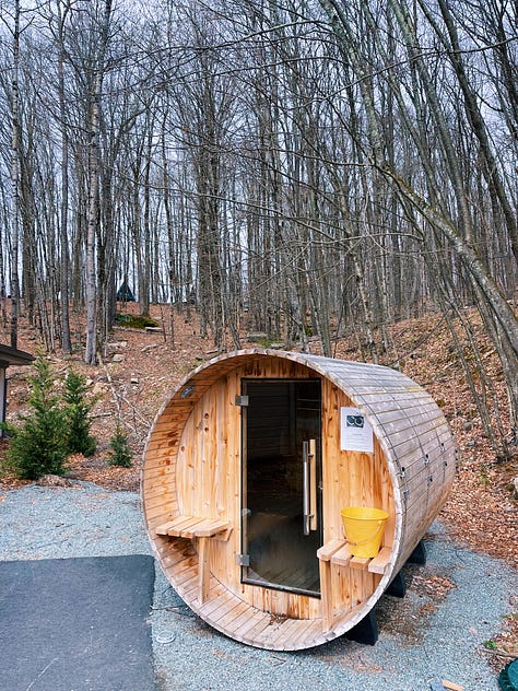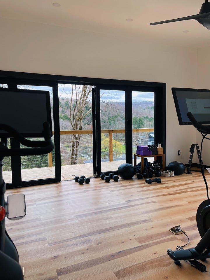Indoor-outdoor gym with the best wooded view (yoga on the deck) plus a barrel sauna to use after your workout sesh
